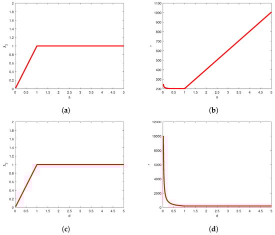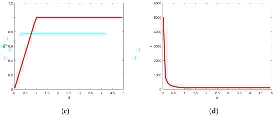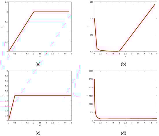 - Let , the relationship between the synchronizability and the inter-layer coupling strength d is shown in Figure 4c,d. When it comes to the unbounded synchronized region, Figure 4c depicts that the value of increases linearly when = a. When , it remains an invariant value . This implies with improving a, the synchronizability of Networks-A is strengthened firstly and then remains unchanged. When it comes to the bounded synchronized region, Figure 4d depicts that the value of r decreases firstly () and then enlarges slowly (). This implies that the synchronizability is improved at the begining, and then continuously reduced after reaching the optimum at .