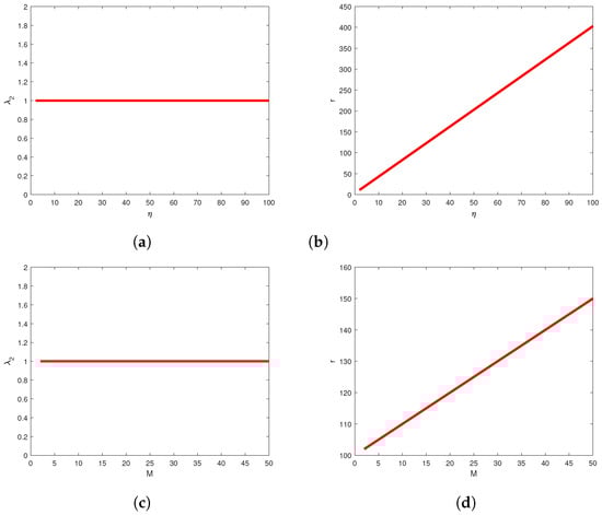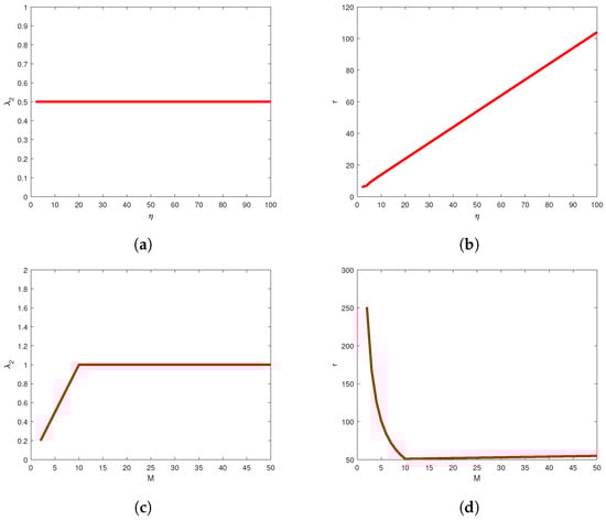 - Let , the relationship between the number of leaves and the synchronizability of Networks-A is shown in Figure 5a,b. Because each layer has N nodes, satisfying , we can plot and r changing with to analyze the impact of the number of leaves on network synchronizability. From Figure 5a, when talking about the unbounded synchronized region, it is clear that the value of remains invariant with the increase of . This indicates that the network size N does not take into account the synchronizability of Networks-A. Figure 5b shows that the synchronizability, the bounded synchronized region, is weakened because r increases as increases.