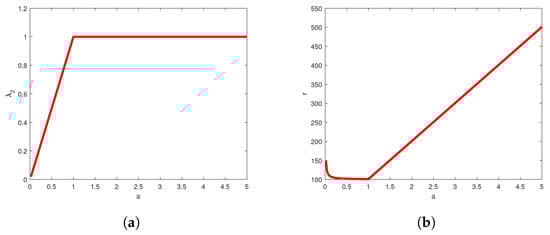 - Let . Figure 6a,b show the variation of and r relative to different values of the intra-layer coupling strength a. For the unbounded synchronized region, it clearly shows that the value of increases linearly at first with a ( ), and then remains invariant at (). This implies that the synchronizability of Networks-B is first strengthened and then holds constant with the increase of intra-layer coupling strength a. For the unbounded synchronized region, panel (b) shows that the value of r firstly decreases slowly and indicates that the synchronizability of Networks-B is enlarged when . It increases monotonically when , representing the capacity becoming weaker. The synchronizability, reaching the optimum with the increase of a, is maximized at .