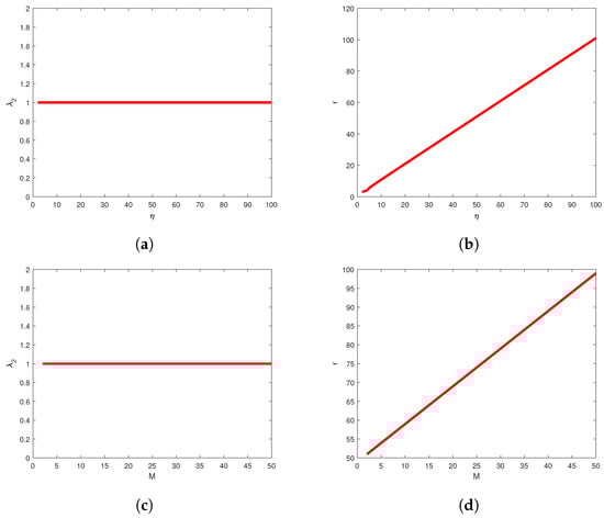 - Let , the relationship between the value of M and the synchronizability is shown in Figure 5c,d. In the unbounded synchronized region, of the supra-Laplacian matrix does not change with the increase of M which means that the capacity of synchronization is unaffected by the number of layers. In the bounded synchronized region, the value of r increases and the network synchronizability is eroded when M increases from 2 to 50, indicating that synchronizability is diminished as the layers increases.