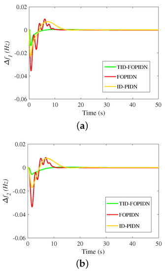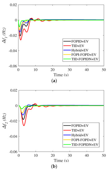 Additional comparisons of the proposed cascaded TID-FOPIDN controller are preformed with the integer order version (cascaded ID-PIDN) controller and the FOPIDN controller. The comparisons are made using scenario 1 with a 1% SLP case study. Figure 16 and Figure 17 show the obtained results for the case studies without and with EV, respectively. It is clear that the proposed cascaded TID-FOPIDN controller achieves lower undershoot values compared with the high undershoot values under the FOPIDN controller. The benefits come from using the additional frequency signal, which enables the proposed controller to damp the low-frequency and the high-frequency disturbances. Conversely, using only the ACE signal can only damp the low-frequency disturbances. Moreover, the results show better damping using the proposed controller compared to the integer order cascaded ID-FOPIDN controller. The improvements come from the additional tunable parameters of the FO operators in the proposed controller.