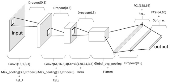 Following each layer, Dropout operations with probabilities 0.3 for the first three layers and 0.5 for fully connected layer 1 are applied. The loss function for model optimization is Cross-entropy Loss. For optimization, ADAM optimizer is employed with a learning rate of 0.001, epsilon parameter of , and weight decay parameter of . Weight decay penalizes the squared magnitude of weight values and can be named the L2 regularization. Regularization has been used in deep learning to prevent weight bias and overfitting.
