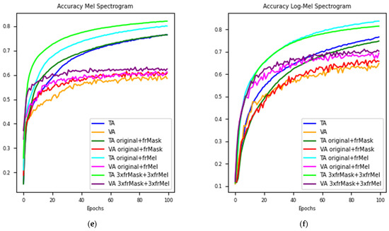 In Figure 2c–f, the loss and accuracy graphs with respect to the epochs are provided. In Figure 2c,d, it is clear that data augmentation reduces the loss both for training and validation data. To achieve saturation, augmented data need fewer epochs. In Figure 2e,f, augmented datasets achieve higher accuracy results both for training and validation. In Figure 2f, augmenting the dataset two times with the Fractional-Order Mel-Scale augmentation method produces higher training accuracy, on the other hand, augmenting the dataset six times with both of the proposed data augmentation methods achieves the highest validation accuracy.