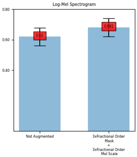 For non-augmented Mel spectrogram features, the accuracy result becomes 58.6%. When we augment the dataset with Fractional-Order Mask and add it to the original dataset, we achieve 60.8% accuracy. When the same procedure is conducted for Fractional-Order Mel-Scale augmentation method, we achieve 61.3% accuracy. When the dataset size is increased by six times with both augmentation methods, the mean accuracy for 10-fold cross-validation becomes 62.5%.