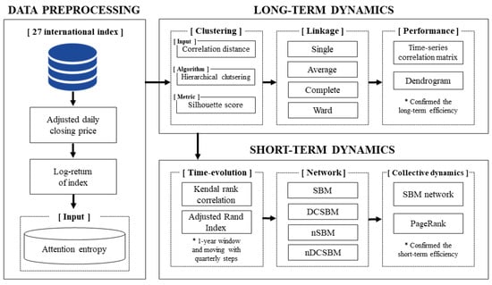 For the experiment, from 27 international indexes, we obtained the adjusted daily closing price and took the logarithm to the return of each index. Through the log-returns and the attention entropy, the final input for analysis was calculated. Note that we ensured that the attention entropy could be fundamental data for long-term and short-term dynamics. In order to confirm the long-term efficiency, we constructed a hierarchical clustering model with the correlation distance and silhouette score. For cross-validation, 4 linkages were applied, and we analyzed the correlation distance matrix and dendrogram of the clustering model. Based on the sliding window model for the short-term dynamics, we observed the Kendall rank correlation (Kendall-) [49] and adjusted rand index (ARI) [50]. Kendall- measures the similarity of informational efficiency ranks between different time points. If high rank correlation is maintained for a certain period of time, it means that a specific event affects the efficiency of the entire system. In order to cross-check the result of Kendall-, we also observed ARI, which evaluates the correspondence between two clusters. Furthermore, constructing the SBM network, we drew inferences of the short-term dynamics with the network and PageRank centrality. A step-by-step scenario of the proposed experiment is illustrated in Figure 1.