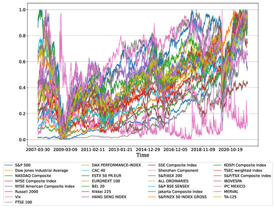 The dataset used in the study was obtained from historical data of Yahoo Finance. Since we analyzed the time-varying efficiency dynamics of 27 major finance markets over a long period of approximately 15 years, the market efficiency results were accurate only when all values existed at the same time. As a result, missing data or incomplete data were preprocessed through Wall Street Journal data. A total of 27 markets were selected based on Yahoo Finance’s World Indices category, and a total of 3912 adjusted daily closing prices were used from March 2007 to July 2022. Therefore, our dataset covered various areas of international financial markets over a long period of 15 years, including the recent global issue of COVID-19. Figure 2 is a scaled value plot for the international financial markets used for the analysis, and Figure 3 is the average plot for the scaled value. For the supplementary explanation of Figure 2, scaled value plots according to geographical region are plotted in Appendix A. Various movement patterns could be confirmed due to the sudden shock in the global financial crisis, the increase due to quantitative easing policy and the recent COVID-19. VIX index, the volatility index of the market, sometimes rises in global events, but not in others, while the dynamic behavior has not clustered recently, but moves similarly and diversely. In the dynamics, we used the log-return, , of international financial market indices as input to analyze the time-varying market efficiency, where and were the logarithm closing prices at time t and . Table 1 is the descriptive statistics of 27 log-returns. On average, it had a mean (Mean) value of 0.02 and a standard deviation (Stdev) of 1.58. Since the skewness was −0.52, the positive log-return value was widely distributed, and the kurtosis was 11.01, which implies a large difference from the normal distribution. In addition, since the null hypothesis that there is no autoregressive conditional heteroscedasticity (ARCH) effect at lags 10 and 20 was rejected at a significance level of 1%, the conditional heteroscedasticity existed in all market log-returns. In addition, augmented Dickey–Fuller (ADF) also rejected the null hypothesis of the series being stationary at 1% significance level, so the international market log-returns did not move stably in a specific range but moved dynamically.