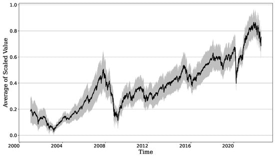 Time evolution of the average scaled value of all 27 market indices between Q1 2007 and Q2 2022 used in the study (gray shaded band means the standard error of the average).