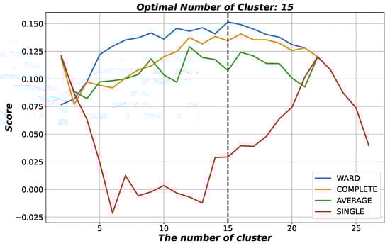 where is the coefficient of the Pearson correlation between the attention entropy series of the i-th market and the entropy series of the j-th market. For the dynamical clustering analysis, and were obtained by sampling the series of efficiency with a 1-year (252-day) sliding time window. Using the correlation distance in Equation (4), we used four linkage algorithms—“Single”, “Average”, “Complete” and “Ward”—to determine the hierarchical clustering. The algorithms recursively merged the pair of clusters in the direction of minimally increasing the within-cluster variance. Finally, the number of clusters was determined by maximizing the silhouette score [47]. The higher the value of the score, the better the cluster structure configuration.