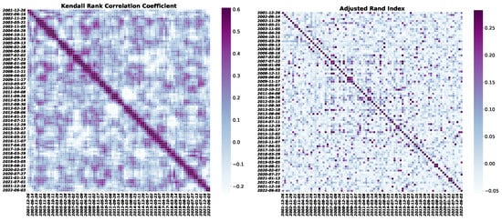 Short-term stability analysis of informational efficiency rankings and clusterings of 27 international markets moving with quarterly steps. (Left) Time evolution plot of the Kendall rank correlation coefficient (kendal-) for all pairs of efficiency ranks at different time windows. (Right) Time evolution plot of the adjusted rank index (ARI) for all pairs of similar efficiency clusters at different time windows.