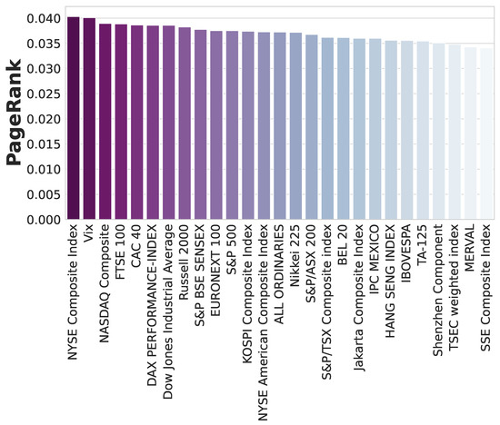Figure 8 shows the complex network of the 27 international markets. The results suggest that the majority are almost always allocated to the same cluster. The network consists of three network modules, and is indicated by different node colors. In addition, through 10,000 sweeps of a Metropolis–Hastings acceptance–rejection MCMC, the probabilities of belonging to certain clusters were measured, and they were displayed together in each partition. The largest network module includes 15 markets and the second partition contains the remaining 11 markets. Since the NYSE Composite Index is highly related to the second cluster, it is better to view the entire system as two modules. Figure 9 demonstrates the centrality ranking of the network using PageRank. The NYSE Composite index (United States), Vix (United States) and NASDAQ Composite (United States) emerge as the most influential international markets, whereas the TSEC weighted index (Taiwan), MERVAL (Argentina) and SSE Composite Index (China) are the least influential for the informational efficiency dynamics. Similar to the result of Figure 8, we can observe that the NYSE Composite Index plays an important role in the network.