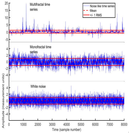 Nonlinear behavior allows a better understanding of complex natural phenomena. Nonlinear dynamics introduces new concepts and tools that will enable the analysis and investigation of the dynamics generated by nonlinear processes. It can be stated that, now, there is a conceptual unification of the notions (attractors, doubling of the period, bifurcations, Lyapunov exponent, and sensitivity to initial conditions) []. Techniques that study the concepts introduced by nonlinear dynamics are grouped under the generic name of nonlinear signal processing or nonlinear analysis. The behavior of a nonlinear dynamic system is figured in the state space or the phase space, a conceptual space in which the dimensions correspond to the variables in the system. Changes in time of the system described by differential equations are reflected by the movements of a point in the state space; movements called trajectories. An image of the change in the state of a system over several time intervals is called a phase portrait. The phase portraits reveal the existence of some attractors, regions, or points of the phase space toward which all close trajectories converge. A strange attractor will occupy a part of the phase space in which all the courses will be captured, apparently randomly, covering its entire surface without repeating. A state space can be created starting from a time series by graphically representing the observations shifted by a specific time interval, a process called state space reconstruction. Figure 1 presents the variation amplitude for different structures using signals such as white noise, monofractal, and multifractal.