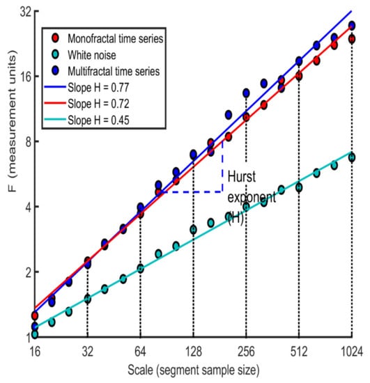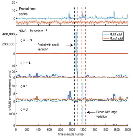 Figure 5 shows the variation in the q parameter that influences small and large fluctuations for a monofractal and multifractal time series.