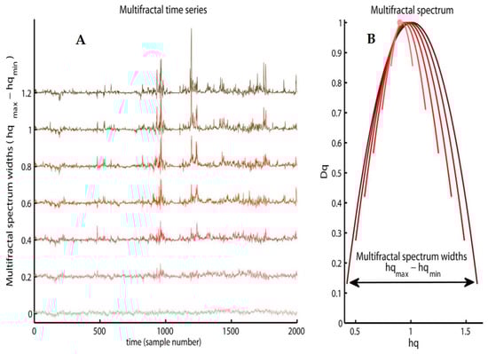 Figure 3 shows the multifractal and continuous time series analysis with the same order q-Hurst q = 2 but with different multifractal spectra. If we compare Figure 3A with Figure 3B, we notice the increase in the structural differences between periods with small and large fluctuations such as the multifractal spectrum, and the width becomes larger. Thus, each mean fractal structure for the Hurst exponent has deviations from the average fractal structure (see Figure 3). In addition, the shape of the multifractal spectrum in Figure 3 need not be symmetrical.