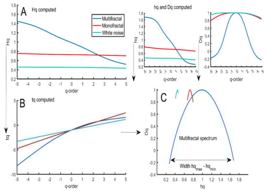 Multifractal spectrum of multiple representations for white noise (green), multifractal (blue), and monofractal (red). Computed Hurst exponent (A), mass exponent (B), multifractal spectrum (C).