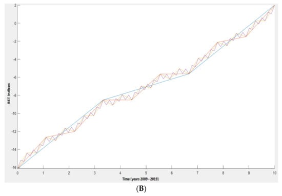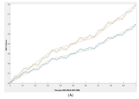 The evolution of the fractal dimension related to the BET index for the period 2005–2019: (A) 2005–2006 (green color) and 2007–2008 (blue color); (B) period 2009–2019.