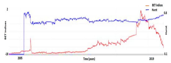 Figure 6 shows the evolution of calculating the fractal dimension for the BET indices performance for the period 2005–2019. The calculation parameters for the fractal dimension are: the dimension equal to 7 and the multiplication factor 2/3. Figure 7 shows the evolution of the Hurst exponent according to the BET index for the period 2005–2019.