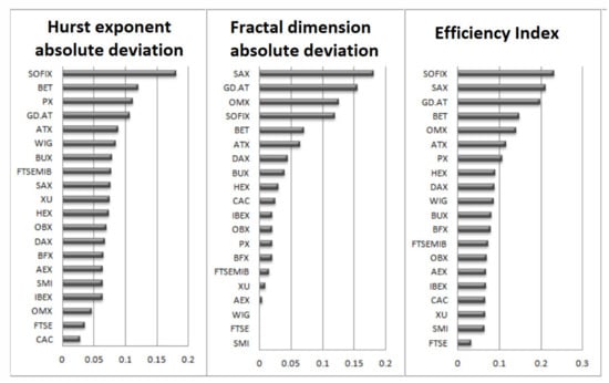 Figure 8 shows the index ranking according to the Hurst exponent, the Fractal Dimension, and the Generalized Measure of efficiency for 2005–2018 (source Bucharest Stock Exchange).