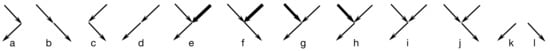 All possible water-flow cases being able to appear by this stochastic model. The bolder line indicates that the drainage area at that site is larger than that of the other site represented with normal lines. When the position of a center is , the dynamical replication probabilities for several cases are as follows: for a, , for e, , and for from i to l, .