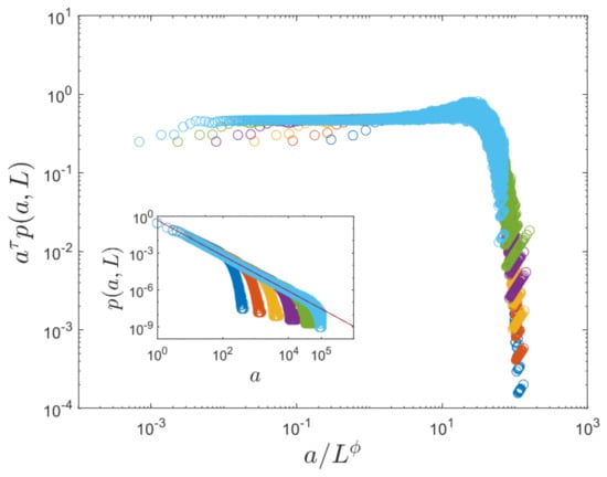 The distribution of drainage areas have been measured for several longitudinal lengths L with . The inset (a) of the Figure 2 shows with for various L and the main panel shows the data collapse of with and .