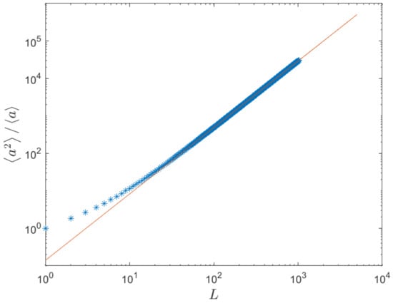 Figure 4 shows a pattern of a river network drawn by this model. In the background, all paths of flowing water from each site into sinks have been drawn in green in the bottom line and the purple lines in the background pattern represent the paths connecting to the largest sink among them, which looks like a real river network with a single sink. Meanwhile, the red line is a sample line representing a flow path of site (x, 1) from a top site to the bottom site and it can be treated as a one dimensional stochastic process. The value of the Hurst exponent H measured by averaging paths of is for as shown in the Figure 5, which is in excellent agreement with that which was obtained from the relation of . This means that the deviation of the stochastic process composed by these one dimensional paths represents the width of the river basin.