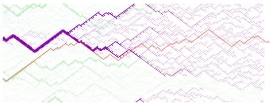 The river network drawn by this stochastic model. In the background, all paths of flowing water from at each site into sinks have been drawn in green. The links sharing a single largest sink are depicted as purple lines. The red line is a sample of the entire path of water flow starting from an initial site.