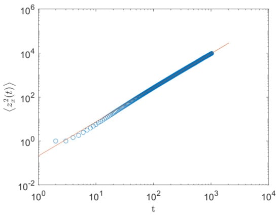 The MSD averaged by the stochastic processes formed by water flows from the initial sites is shown and the slope of the straight guide line represents .