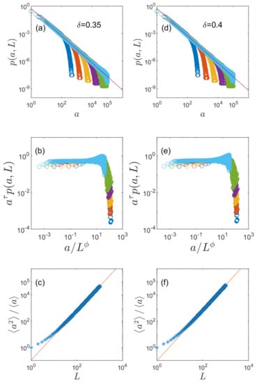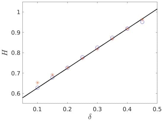 Meanwhile, by changing values of the parameter we have obtained the different values of the exponents. Figure 6a shows the plot of the distribution of the drainage area versus the drainage area a for various L with . The straight guide line represents that the value of the exponent is and in the Figure 6b it is shown that the data of are well collapsed with the values of the exponents, and . Figure 6c shows the plot of versus the length L and the straight guide line represents that the value of the exponent becomes 1.87. In the Figure 6d–f, we have measured the values of the exponents for and have obtained and . Although the values of exponents for real basins span a small range rather than a specific value, these exponent values for and are slightly larger than the measured values in real basins. It means that a certain range of the parameter in the model can be suitable for describing the fractal natures of river basins. We have measured the Hurst exponents for various values of by two independent methods. One is obtained from the MSD of (star symbols in the Figure 7) and the other is obtained by measuring the characteristic drainage area (circle symbols in the Figure 7). It can be seen that both values are the same overall. The slight difference between two values of H for small can be originated from the initial behaviors that could be affected differently according to the development of the drainage area. As a result we have found that the Hurst exponent H is almost linearly increased as increases as shown in the Figure 7 and especially, for , it matches the values measured in real basins well.