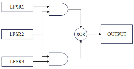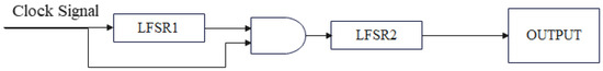 The clock-control generator uses the sequence generated by one LFSR to control the shift of another LFSR [26], with the maximum period being . We show the clock-control generator in the Figure 3.