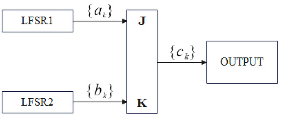 The sequence from is directly input to the J terminal of the J-K flip-flop and the sequence from is input to the K terminal. When the gates of the two LFSRs are and , the period of the output sequence is .