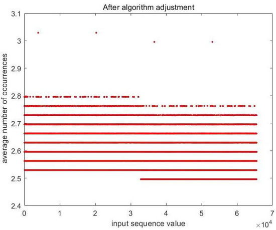 Figure 7 shows matrix A of dimensions , which uses Algorithm A3 without the Formula (24). The horizontal axis is the value of the input sequence, traversing all sequences from 0x0001 to 0xffff; the vertical axis is the mathematical expectation of the offset sequences in matrix A in the 2000 left-shift operations.