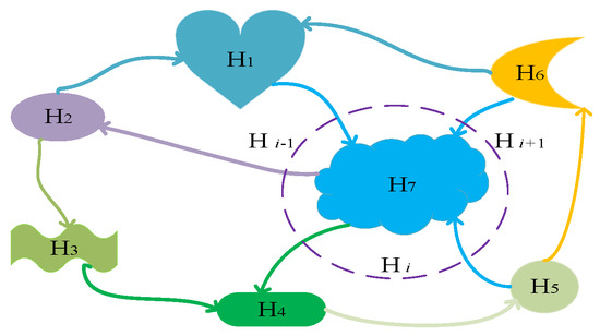The core operation of the BBO algorithm is to simulate the migration and mutation of biological populations [18]. Among them, the migration operation is designed to facilitate information sharing. The migration of each species’ habitat is shown in Figure 1, where H1 denotes the first population habitat (H2 denotes the second population habitat,…, Hi+1 denotes the i + 1th population habitat) which can receive species from H2 and H6, while some species in this habitat emigrate to H7. In addition, we used the mutation operation to scientifically simulate the possible species variation caused by a change in the environment of the habitats. Furthermore, Table 1 shows the correspondence between the BBO algorithm and biogeography theory [19].
