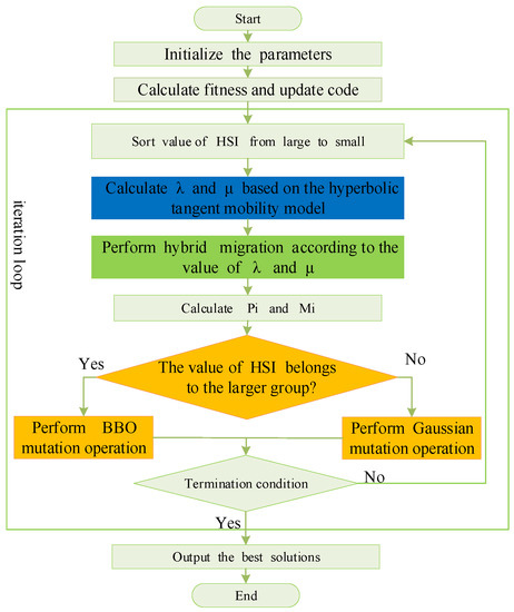 The improved BBO algorithm is called the HDBBO algorithm because it involves hybrid migration and dual-mode mutation. The flowchart of the HDBBO algorithm is shown in Figure 2.