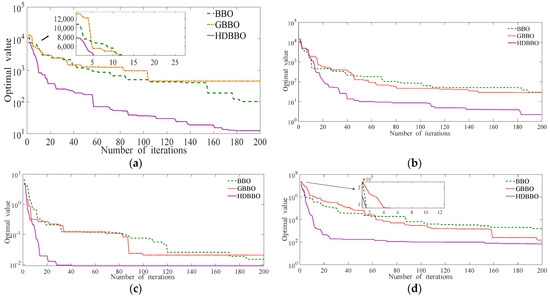 As Gaussian mutation is similarly involved in the improved strategy of the BBO algorithm, the proposed improved algorithm is called the GBBO algorithm [25]. To demonstrate the superiority of the HDBBO algorithm compared with the conventional BBO and GBBO algorithms, we carried out experiments under the same running environment and parameters. We defined in this group of experiments, and the influence of different values on the HDBBO algorithm was determined in the next group of experiments. Based on these conditions, the comparison results of 11 benchmark functions are shown in Table 3.