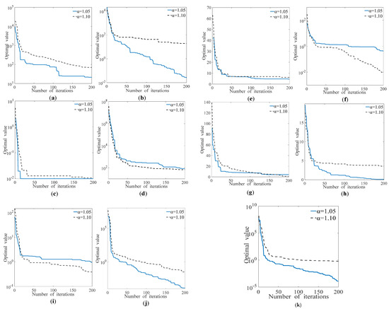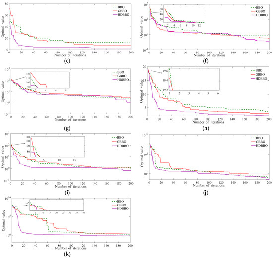 Comparison of different values in the HDBBO algorithm (a–k) on the convergence of − .(a) convergence of different on benchmark function ; (b) convergence of different on benchmark function ; (c) convergence of different on benchmark function ; (d) convergence of different on benchmark function ; (e) convergence of different on benchmark function ; (f) convergence of different on benchmark function ; (g) convergence of different on benchmark function ; (h) convergence of different on benchmark function ; (i) convergence of different on benchmark function ; (j) convergence of different on benchmark function ; (k) convergence of different on benchmark function .