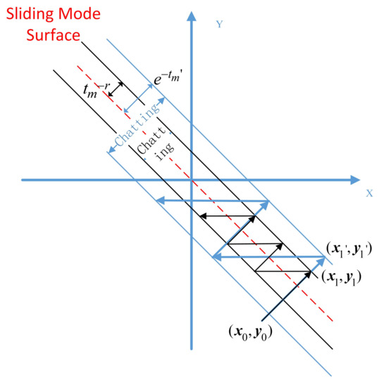 Figure 1 shows the comparison between fractional-order sliding mode control and integer-order sliding mode control. When the system state variable moves on the sliding surface, the switching control takes effect, and it takes time for the control output to switch from + to . This process is called time delay. Time delay is the main cause of chattering. In Figure 1, when the system state reaches the sliding surface from the initial state (, ). For fractional-order systems, the switching control takes effect only when the system state reaches (, ), and the delay at this time is . The system state will converge to zero in the form of . For an integer-order system, the switching control comes into play at (′, ′), where the delay is ′. The system state will converge to the origin in the form of . The delay time of the system depends on the actuator, so = ′, that is, when , >. It can be seen from the above analysis that the chattering of the fractional-order system is smaller than that of the integer-order system, and the fractional-order system can effectively suppress the chattering added [39,40].