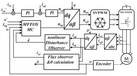 To sum up, the diagram of the composite control system of AM based on MFFSMC is shown in Figure 2. The composite control system consists of flux linkage regulator, speed regulator, vector coordinate transformation module, space vector pulse width modulation module, converter module, asynchronous motor, flux linkage observer, and non-linear disturbance observer, where the flux linkage regulator is a cascaded PI controller, speed regulator is the designed MFFOSMC controller.