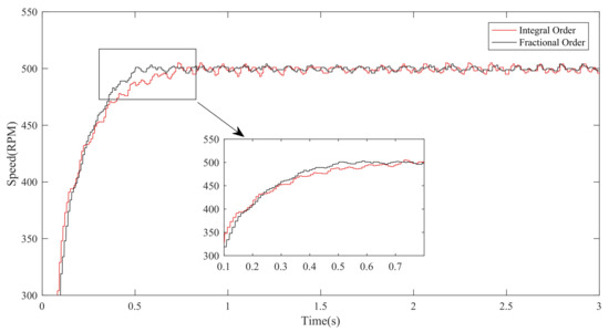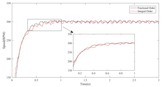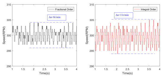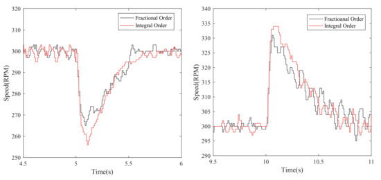 To further verify the robustness for external disturbance, the anti-disturbance experiment is provided. In order to test this performance, when the motor is running at 300 r/min, the load torque of 3.5 N·m is suddenly added to the motor at s and removed at s. The anti-disturbance curve of 300r/min speed is shown in Figure 7. Figure 7 illustrates that the steady-state speed of the fractional-order sliding mode controller fluctuates to 265 r/min when the load torque is added in 5 s, and returns to the set speed at 5.6 s; the steady-state speed of the integer-order sliding mode controller fluctuates to 258 r/min, and reaches the set speed at 5.8 s. When the load torque is canceled within 10 s, the speed of the integer-order sliding mode controller fluctuates to 338 r/min, and resumes the set speed at 10.8 s; the speed of the fractional-order sliding mode controller fluctuates to 332 r/min, and reaches the set speed at 10.8 s. The results prove that the fractional-order sliding mode controller can better reduce the impact of disturbance, increase the robustness of the system.