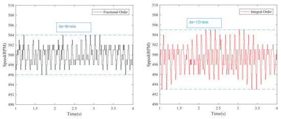 Finally, the control performance of the proposed method under high reference speed is tested, and the experimental results are shown in Figure 11 and Figure 12. Figure 11 shows that based on two methods is 0.82 s and 0.9 s, respectively. Figure 12 indicates that the steady-state speed fluctuation with the fractional-order sliding mode controller is 10 r/min, while the steady-state speed fluctuation with the integer-order sliding mode controller is 12 r/min. According to the above analyses, the proposed MFFOSMC + NDO has the better transient performance and the smaller speed fluctuation.