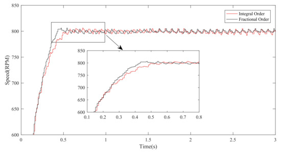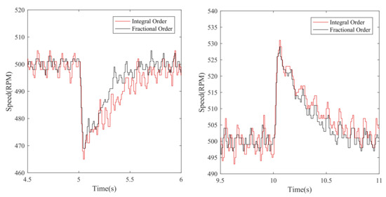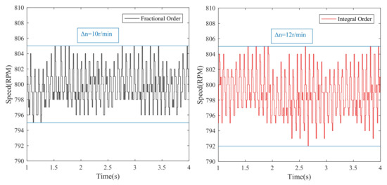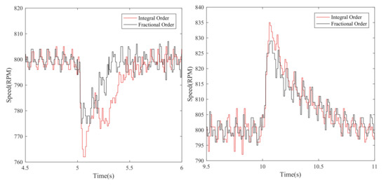 The robustness performance for the disturbance under high speed is very important. To validate the superiority of the proposed approach, when the motor is running at 800 r/min, the load torque of 3.5 N·m is added to the motor at s and removed at s. The results are shown in Figure 13. It is obvious from Figure 13 that when the load torque is added in 5 s, the speed with the integer-order sliding mode controller fluctuates to 763 r/min, and returns to the set speed at 5.8 s; the speed with fractional-order sliding mode controller fluctuates to 775 r/min, and reaches the set speed again at 5.5 s. When the load torque is canceled at 10s, the speed with the integer-order sliding mode controller fluctuates to 835 r/min, and resumes to the set speed at 10.8 s. The speed with fractional-order sliding mode controller fluctuates to 828 r/min, and reaches the set speed at 10.8 s. The results above show that the proposed method under high speed has the strong robustness.
