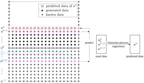 - From the obtained hyper-parameters of step 3, (10) is used to predict the solution for the second time step and obtain artificially generated data , where points are randomly sampled from . We also obtain the delay term data () and the inhomogeneous term data by randomly selecting points on , then obtain the boundary data by randomly selecting points on .