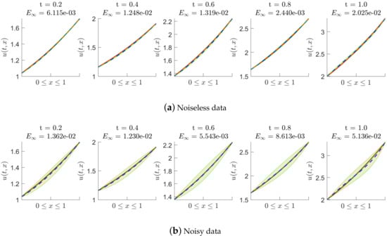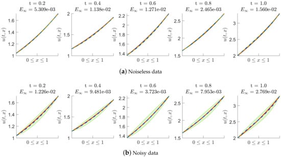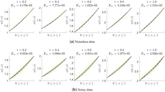 Fractional equation of Example 1: the posterior distribution of the predicted solution at different time nodes, where is fixed to be . The red solid line represents the exact solution. The blue dash line represents the posterior mean. The green shade indicates the two posterior standard deviation centered on the posterior mean. Noiseless data and noisy data are used, respectively.