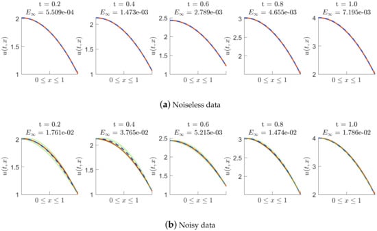 Numerical tests of solving (74) are performed with noiseless data. Figure 10 shows the posterior distribution of the predicted solution at different time nodes, where we fix the number of initial data points (inhomogeneous term data points, artificially generated data points and delay term data points) to be 15 and fix to be 0.01. Figure 9a,b, presents the results of the experiments employing the second-order central difference scheme and the backward Euler scheme, respectively, and Figure 9c shows the maximum absolute error with the increase in time. Moreover, Table 8 shows us the maximum absolute error at some time nodes in detail. According to the results of numerical tests, we conclude that the two methods based on MP-NGPs effectively solve the wave equation with one delay. The second method applying the backward Euler scheme behaves better than the first method, applying the second-order central difference scheme on prediction accuracy.