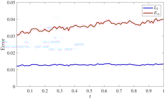 Problem of Example 3: Time versus the relative spatial error and maximum absolute error until the final time step is reached, where is fixed to be 0.01.
