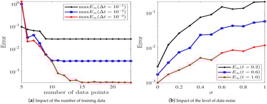 Numerical tests applying the backward Euler scheme to solve (22) will be performed with noiseless data. Figure 6 shows the relative spatial error and the maximum absolute error with the increase in time, where we fix the number of initial data points (inhomogeneous term data points, artificially generated data points and delay term data points) to be 20 and to be 0.01. The number of training data points on each boundary line is fixed to be 5. Furthermore, Table 4 shows the relative spatial error and the maximum absolute error at some time nodes in detail. According to the experimental outcome, we can conclude that the method is still effective when solving nonlinear time-dependent delay equations with high dimensions and multi-delays.