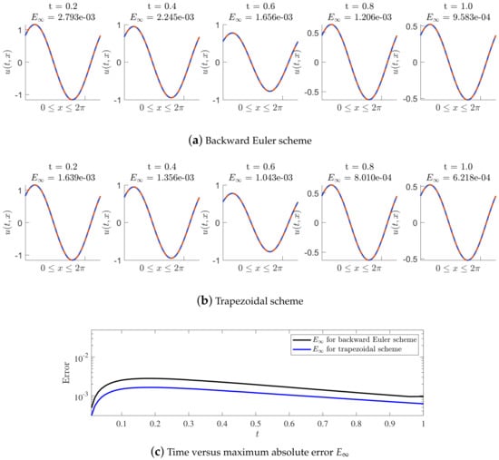 The trapezoidal rule is applied under the structure of Runge–Kutta methods to (26) with , , and replaced by , , and , respectively. Then we have