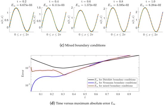 Example 5: Maximum absolute error at some time nodes, where , where Dirichlet, Neumann and mixed boundary conditions are used, respectively.