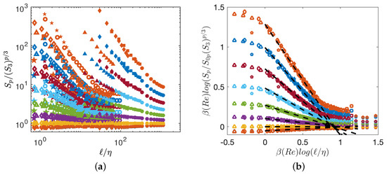 Test of universality using structure function based on wavelet transform. (a) K41 universality, given by Equation (3); (b) multi-fractal universality, given by Equation (35). DNS are shown with open symbols, while experiments are shown with filled symbols. The structure functions have been shifted by arbitrary factors for clarity and are coded by color: : blue symbols; : red symbols; : orange symbols; : magenta symbols; : green symbols; : light blue symbols; : dark red symbols; : blue symbols; : red symbols. Note that on that graph, the symbols are hidden behind the symbols, because both have very weak intermittency. For K41 universality to hold, all the function should be constant with p, with a level depending on p. The dashed lines are power laws with exponents . Figure adapted from Geneste et al. [3].