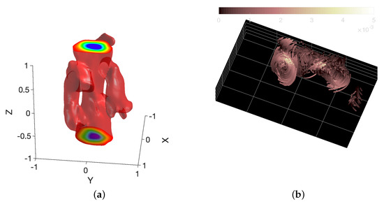 The previous “gradient catastrophe” scenario is interesting because large gradients curvature are typically observed during vortex reconnection, where “vorticity kinks” are built at early stages. Evidence of a singularity was actually observed in a simplified model of reconnection by Moffatt and Kimura [55,56]. In this model, vorticity filaments are also modeled by lines with constant vorticity density. Two filaments are initially placed at the ridges of a tetrahedra, and then allowed to interact via their mutual velocity field computed using the Biot–Savart law. The vortices interaction results in a self-similar evolution, with vorticity diverging as as the distance between the two filaments decreases as . There laws are exactly the laws that one would expect from scale symmetry argument of the viscid Navier–Stokes equation, that corresponds to a typical pseudo Holder exponent . It is not yet clear whether this blow-up scenario via reconnection is indeed present in Navier–Stokes, where interactions are more complex and self-regularizing mechanisms are present [57]. On the one hand, this blow-up scenario may explain why most irregular places are found near vortex interaction (see previous section). On the other hand, the value is forbidden by the properties of NSE (see Section 2.3.3), and no value of h lower than has ever been observed.