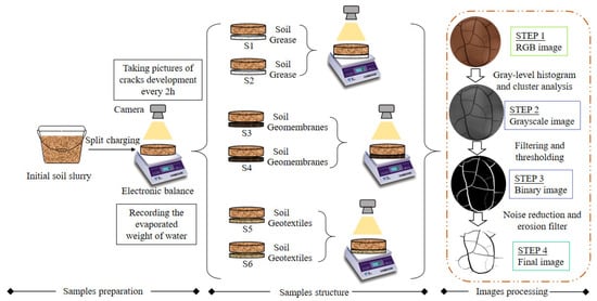 The prepared soil was fully mixed with distilled water to prepare saturated mud with a water content of 130%. The mud was placed on a shaking table and vibrated for 5 min to remove bubbles in the mud. Six round glass containers were used to hold the mud, with an inner diameter of 20 cm and a height of 4 cm. Grease was applied to the bottom of the container to reduce the floor roughness during mud drying shrinkage. The sample numbers were S1 and S2, where S2 was a parallel sample. Geomembranes and geotextiles were cut into regular circles with a radius of 10 cm and were placed at the bottom of the glass container. The samples were numbered S3, S4, S5 and S6, where S4 and S6 were parallel samples. Then, the saturated mud was carefully poured into containers, and the weight of the mud in each container was about 300 g. The sample preparation process and image processing process are shown in Figure 1. Table 1 summarizes the parameter information of the test samples.