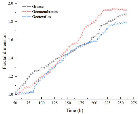 Figure 3 shows the variation process of the fractal dimension with evaporation duration during the development of sample surface cracks under different test conditions. The dry shrinkage fracture network formed on the soil surface had good statistical self-similar classification characteristics. The fractal dimensions of three soil substrate contact conditions (grease, geomembranes, and geotextiles) were between 1.238 and 1.93. When the crack network on the soil surface stopped developing, the fractal dimensions under the three experimental conditions were 1.88, 1.93 and 1.79, respectively. When the substrate contact condition was geomembranes, it had the largest fractal number, and when the substrate contact condition was geoextensions, it had the smallest fractal number. From the final state, when the contact condition of the soil substrate was geotextiles, the final fractal dimension was reduced by 4.79% and 7.25%, compared with the other two contact conditions.